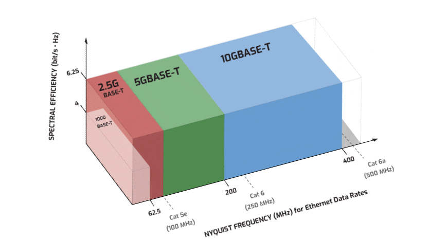 Figure 1: 10GBASE-T has a Nyquist frequency of 400 MHz, i.e. most transmitted data is contained below this frequency. Reducing the speed to 5 Gbps (5GBASE-T) reduces the Nyquist frequency to 200 MHz, thus falling within Category 6 cable’s specified bandwidth. Reducing the speed to 2.5 Gbps (2.5GBASE-T) reduces the Nyquist again by half to 100 MHz, within the specified bandwidth of Category 5e cable.