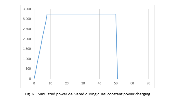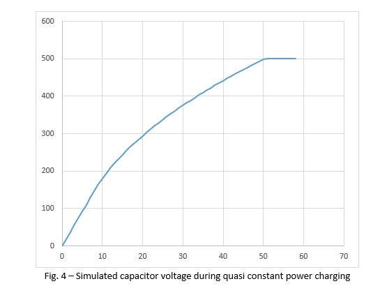 This process is depicted in figure 4 below, which shows the simulation results of the voltage across the capacitor when charged by a quasi-constant power (QCP) capacitor charging power supply (vertical axis in Volts, horizontal axis in mSec.). The simulation parameters are: