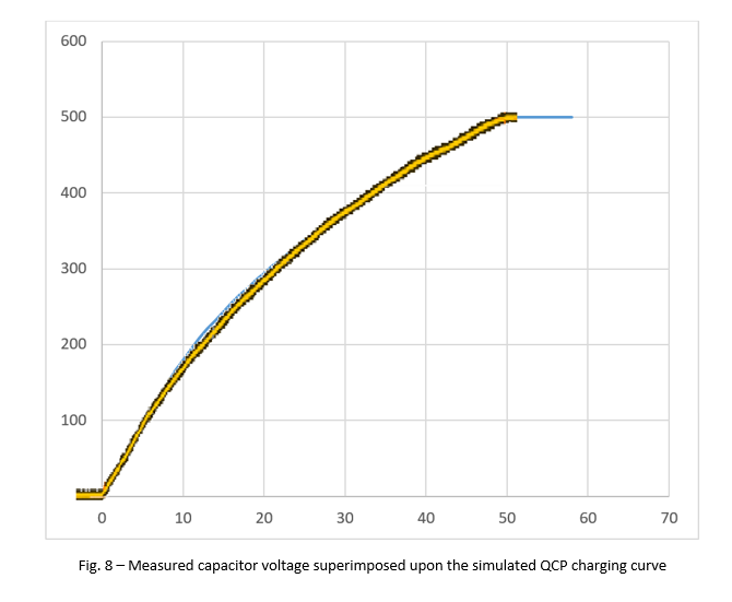 The measured result shown in figure 7 (capacitor charged from zero to 500V in 50mS) compares very well with the theoretical, simulated charging curve shown in figure 4: they are almost identical with a minor deviation during the period between 8mS and 22mS, as can be seen in figure 8 below, in which the measured capacitor voltage (in yellow, as previously shown in figure 7) is properly scaled and superimposed upon the simulated quasi constant power (QCP) charging curve (in blue, as previously shown in figure 4).
