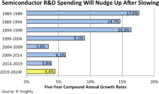 While consolidation in the semiconductor industry contributed to lower growth rates in R&D spending in the past five years, the long-term trend has been for a slowdown in annual increases of research and development expenditures since the 1980s, according to data presented in the new edition of IC Insights’ McClean Report—A Complete Analysis and Forecast of the Integrated Circuit Industry, which was released in January 2020. However, technical challenges including three-dimensional die-stacking technologies, the move to extreme ultraviolet lithography in advanced processes, and growing complexities in products are expected to lift R&D budgets by slightly higher growth rates in the 2019-2024 period (Figure 1).