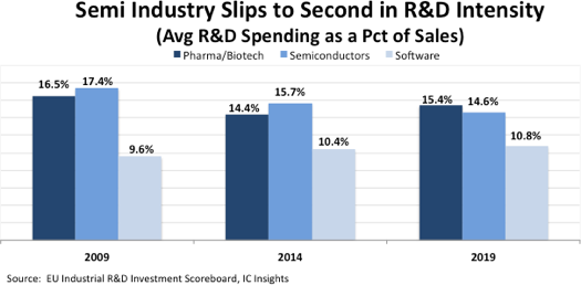 Since the 1990s, the semiconductor industry has led all other major industrial segments in R&D intensity, with annual spending on research and development averaging about 15% of total sales, according to data compiled by IC Insights. Over the last three years, however, the semiconductor industry’s R&D-to-sales percentage slid to 13.5% in 2017 and 13.0% in 2018 primarily because of extremely high revenue growth in memory ICs.  The industry’s R&D/sales ratio rebounded to 14.6% in 2019 when memory IC revenues fell 33% and the entire semiconductor market dropped 12%. The pharmaceuticals and biotechnology sector moved into the top position in the 2019 ranking with an R&D/sales ratio of 15.4%, based on a global survey in the European Union Industrial R&D Investment Scorecard report (Figure 2).