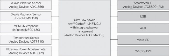 The iCOMOX platform leverages an array of cutting-edge low power technologies. At the platform’s heart lies an ultra-low power Analog Devices ADuCM4050 ARM Cortex M4 microcontroller unit (MCU) with integrated power management capabilities. A low noise Analog Devices ADXL356 3-axis accelerometer with analog bandwidth of 1.5kHz serves as a low power vibration sensor and an Analog Devices ADXL362 accelerometer operates as an ultra-low power, low-G wake-up trigger. Other low power key components include an Analog Devices ADT7410 temperature sensor with ±0.5°C accuracy and 16-bit resolution, a Bosch BMM150 3-axis magnetic field sensor, and an Infineon IM69D130 high-performance digital dual backplate MEMS microphone. On demand, additional sensors might be connected directly to the MCU.