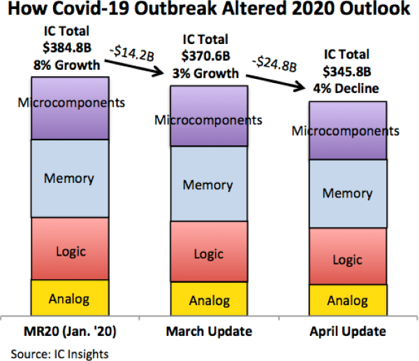 When 2020 started, global economic conditions pointed to single-digit percentage sales growth in the IC market after it fell by 15% in 2019, based on worldwide market data compiled by IC Insights for the 2020 edition of The McClean Report—A Complete Analysis and Forecast of the Integrated Circuit Industry (MR20). However, the world abruptly changed in 1Q20 with the rapid outbreak of the Covid-19 virus, which shut down nearly all countries and paralyzed global markets beginning in March 2020.