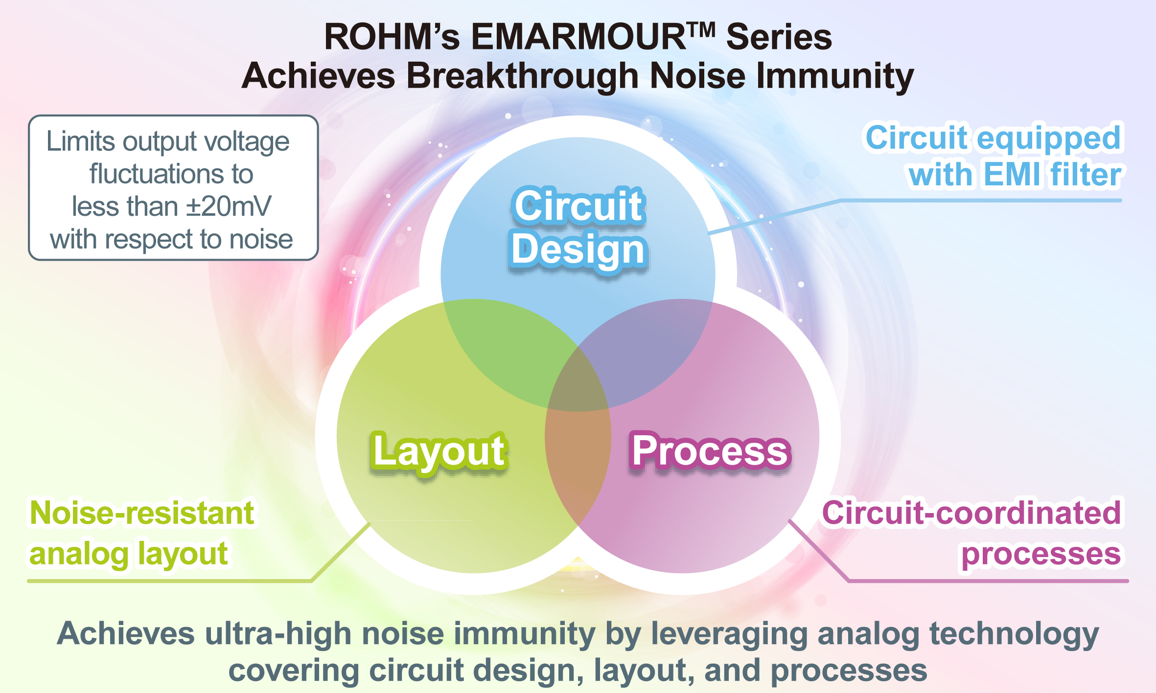 EMARMOUR™ is ROHM’s unique brand to identify its products that leverage proprietary technologies covering circuit design, layout, and processes to achieve ultra-high noise immunity. This technology limits output voltage fluctuation to less than ±300mV across the entire noise frequency band during noise evaluation testing under the international ISO11452-2 standard. This unprecedented noise immunity reduces design resources while improving reliability by solving issues related to noise in the development of a variety of systems.