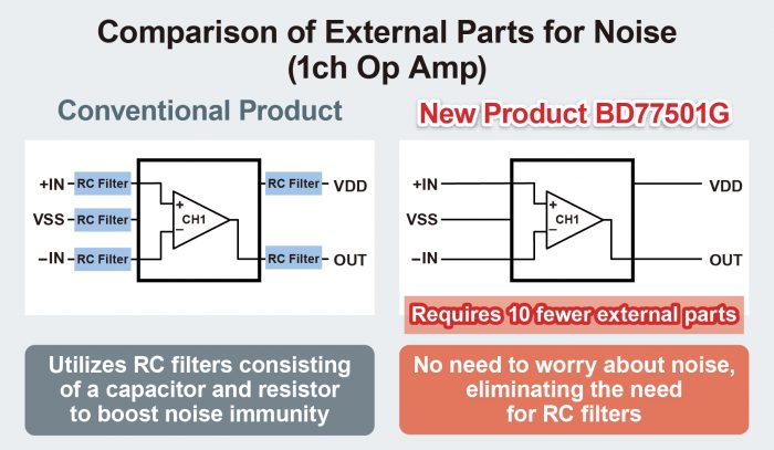 The BD77501G provides superior noise immunity that eliminates the need for external noise countermeasure components conventionally required for standard products (i.e. RC filters for the power supply, input, and output pins). For example, in the case of a 1ch op amp, ROHM’s new product uses 10 fewer external components than conventional solutions.