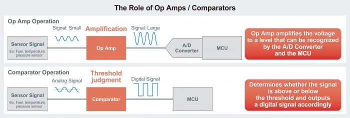 Op amps (operational amplifiers) are designed to amplify input signals. They are often used to amplify minute signals, such as those output from sensors, to a voltage level that can be recognized by an MCU.