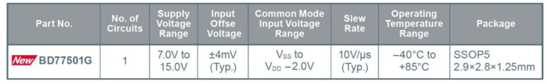 The BD77501G utilizes original Nano Cap™ power supply technology to achieve extremely stable control, making it the industry’s first op amp that completely eliminates oscillation induced by load capacitance (i.e. wiring) while supporting high-speed amplification (high slew rate: 10V/us) required in anomaly detection and other systems.