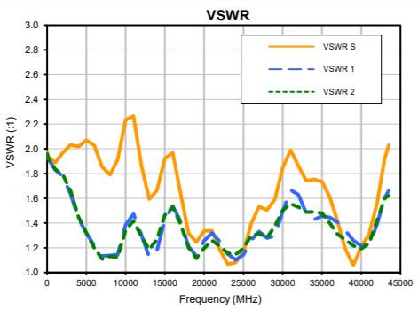 Another improvement was in the overall design of the leadframe itself. Specifically, the EM simulations showed unwanted coupling between pins, even if unconnected internally or grounded externally. This coupling substantially degraded high frequency response. The EP2KA+ two-way MMIC splitter (10 to 43.5 GHz) is a perfect example of this pin optimization approach. We started with the same package as the MGVA-82+ (DC to 5.2 GHz dual matched amplifier), and by selectively removing pins from the leadframe (Figure 5.), were able to measurably improve the input to output isolation, as well as the amplitude and phase unbalance. The leadframe bond pad optimization also improved input/output VSWR to better than 2:1 over the majority of the band (Figure 6.).