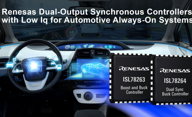 TOKYO, Japan ― Renesas Electronics Corporation (TSE:6723), a premier supplier of advanced semiconductor solutions, today announced a pair of new 42V dual synchronous controllers with the lowest 6µA quiescent current and integrated 2A source/3A sink MOSFET drivers that provide primary power stage solutions for the Renesas R-Car H3 and R-Car M3 SoCs. The ISL78264 dual sync buck controller manages the intermediate first stage DC/DC conversion, stepping down the 12V battery system to 5V and 3.3V to power the vehicle’s electronic control unit (ECU), in-vehicle infotainment (IVI) and digital cockpit systems with 50W-200W power levels. The ISL78263 dual sync boost and buck controller provides DC/DC conversion to support power levels of 25W-100W, while providing a pre-boost if the battery voltage (VBAT) dips to as low as 2.1V during a cranking transient or a start/stop event.