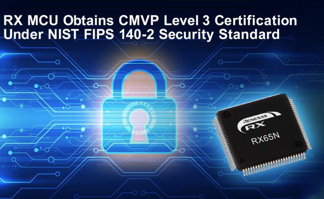 TOKYO, Japan ― Renesas Electronics Corporation (TSE:6723), a premier supplier of advanced semiconductor solutions, today announced that its 32-bit RX65N microcontroller (MCU) has achieved Cryptographic Module Validation Program (CMVP) (Note 1) Level 3 certification under the FIPS 140-2 security standard by the National Institute of Standards and Technology (NIST). The RX65N is the world’s first general-purpose MCU to obtain level 3 certification (Note 2).