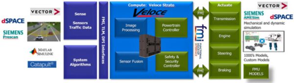 Verification/validation of an AD controller must deal with sense, compute, and actuate. Sense collects sensory information to capture driving scenarios. Compute performs algorithmic processing of those scenarios to formulate a decision. Action acts on those decisions by sending commands to the engine, transmission, steering and braking system, calling for integration of several technologies. Hardware emulation computes the sensor data generated by a virtual environment like VECTOR CANoe, dSPACE, or Siemens Pre-Scan, and generates actions to be sent to actuate implementation via functional models for the engine and steering wheel, such as Siemens AMESim, and others.