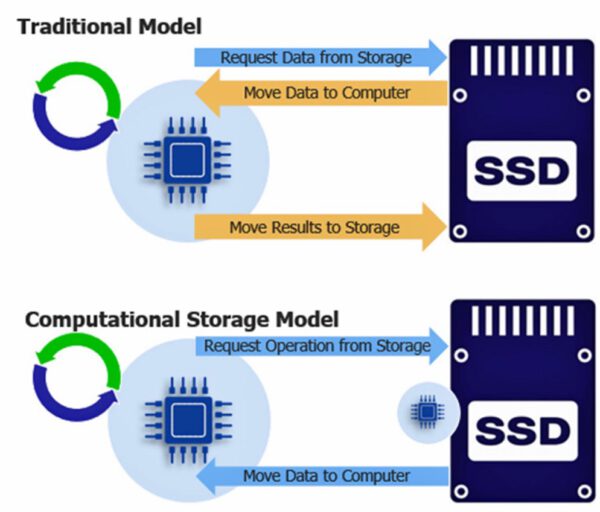 In the SSD, a host computer issues a request for data to the storage drive. Storage sends the data to the computer and the computer writes the processed data back to storage. In the CSD, the host computer sends a request to a lightweight computer installed locally within the CSD. The local computer, instead of sending the data back to the host, processes the data “in situ” and sends the results back to the host.