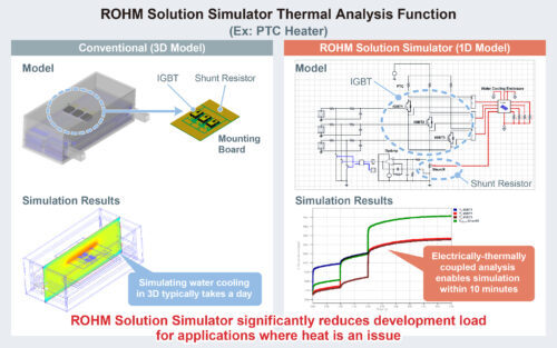 December 2021 – ROHM has recently added a new thermal analysis function to its ROHM Solution Simulator. The new feature allows designers of electronic circuits and systems in the automotive and industrial markets to collectively verify power devices and driver ICs thermal issues on different solution circuits.