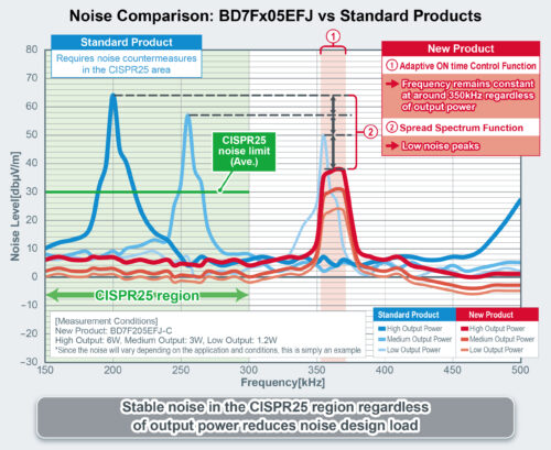 The BD7Fx05EFJ-C is also equipped with an adaptive ON-time control function that fixes the switching ON time, ensuring a stable frequency of around 350kHz regardless of output power. To be compliant with the CISPR25 automotive EMC standard requires considerable noise design in the frequency range from 150kHz to 300kHz, but as ROHM’s new converters do not fall within this band, noise countermeasures can be greatly simplified. This, together with a spread spectrum function that minimizes radiated noise, contributes to reducing the number of efforts for noise design.