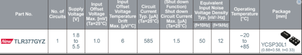 The TLR377GYZ succeeds in balancing miniaturization with high accuracy (which has been difficult to achieve with conventional op amps) by further evolving proprietary circuit design, process, and packaging technologies cultivated over many years.