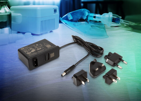 The series provides four output voltage models, 12V, 15V, 19V, and 24VDC, and is specifically designed for applications in respiratory care, patient monitoring, diagnostic equipment, imaging systems and test & measurement. A wide 80 to 264VAC input range supports global operation. Interchangeable AC input plugs for use in North America, Europe, the UK, and China are available, allowing a single platform to be used across regions; plugs can also be supplied separately to match regional requirements.