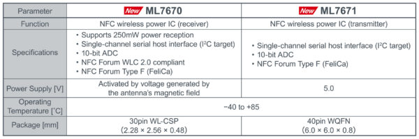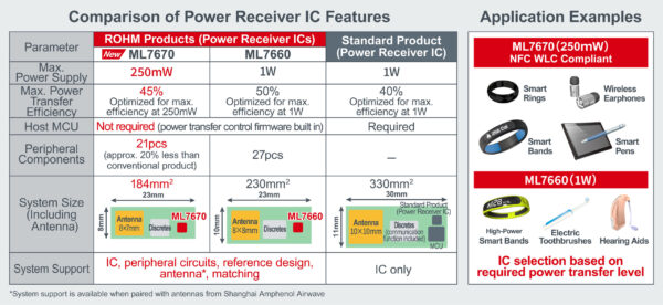 ROHM has developed a wireless power supply IC chipset consisting of the receiver – ML7670 – and transmitter – ML7671 – compatible with Near Field Communication (NFC) technology for compact wearables such as smart rings and smart bands as well as peripheral devices like smart pens.