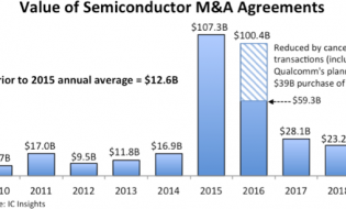 http://www.icinsights.comJanuary 21, 2019Comments Off on Value of Semiconductor Mergers and Acquisitions Falls Considerably