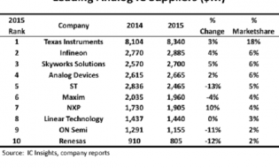 The 2015 analog market grew 2% to $47.0 billion. Combined sales of general-purpose analog products (amplifiers/comparators, interface, power management, an signal conversion devices) increased 2% to $19.1 billion and sales... Read More